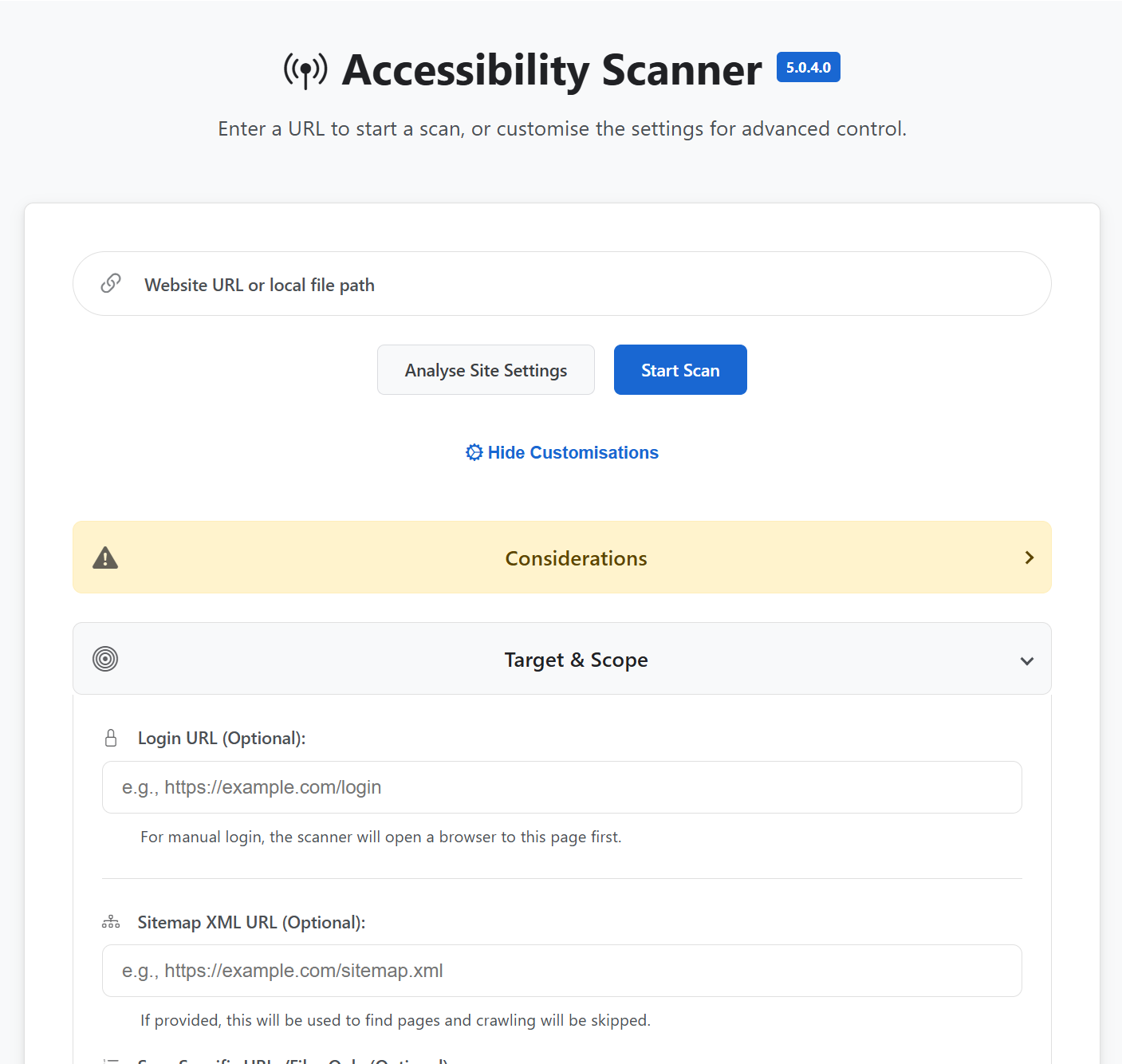 The Accessibility Scanner is a locally-hosted desktop application for advanced, automated accessibility auditing. It is designed for developers, testers, and accessibility specialists who require granular control over the scanning process. This alpha release provides a comprehensive feature set built upon Puppeteer for browser automation and the Axe-core engine for accessibility analysis.