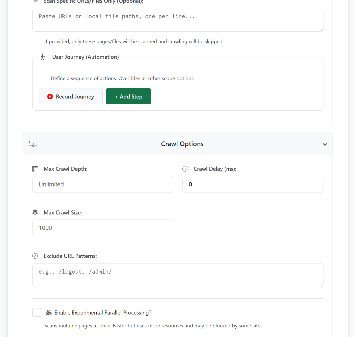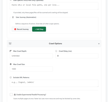 .xmlor.gz), or a predefined list of local and remote URLs. - User Journey Emulation: Test dynamic applications and authenticated user flows by scripting a sequence of browser actions. The journey builder supports operations such as navigation, clicks, text input, and select-box interactions, allowing scans to be triggered at any point within a complex workflow.