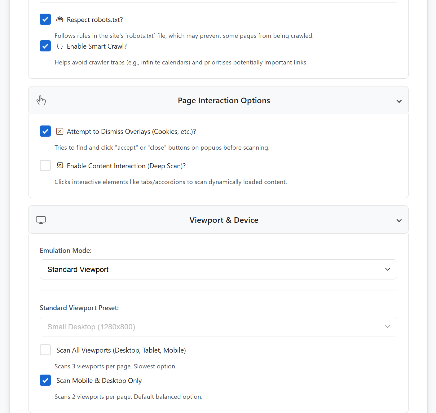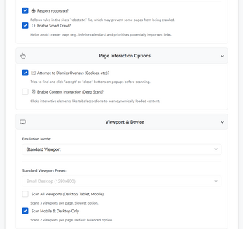 - Device & Viewport Emulation: Emulates a wide range of devices via a library of built-in presets or through fully customisable parameters, including screen dimensions, user-agent strings, and device scale factors. It also supports scanning all standard viewports (desktop, tablet, mobile) in a single session for comprehensive responsive testing.