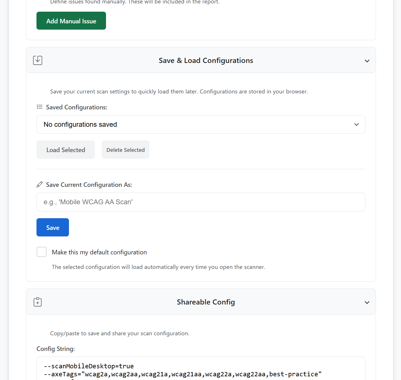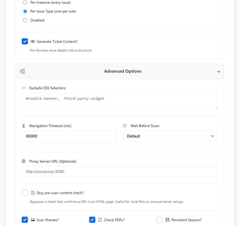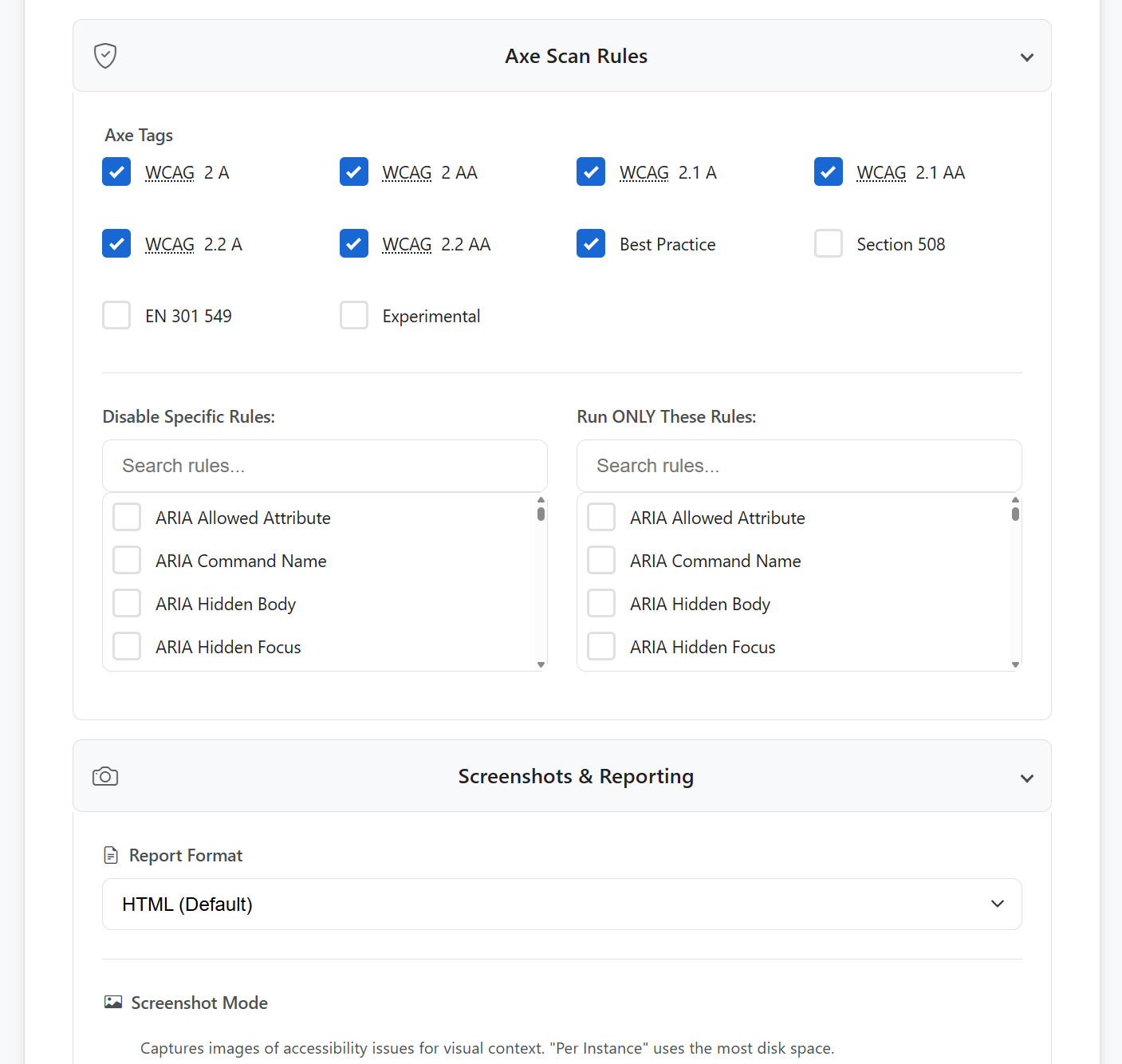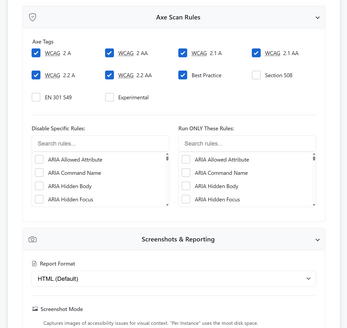 - Granular Axe-Core Rule Customisation: Allows for audits to be configured beyond standard WCAG tags by either disabling specific Axe rules or supplying a list of specific rules to run.