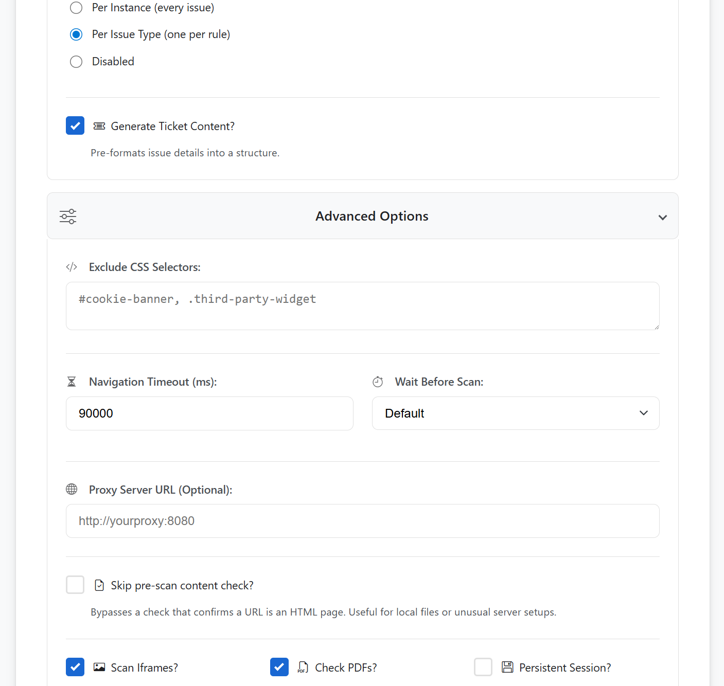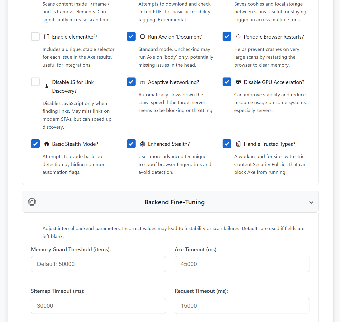 - Network & Environment Control: Supports proxy routing for all scan traffic via HTTP, HTTPS, or SOCKS protocols. The application provides granular control over system timeouts (e.g., navigation, Axe-core execution) to accommodate diverse network conditions.