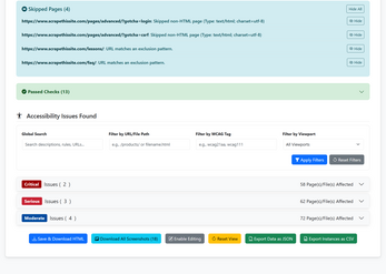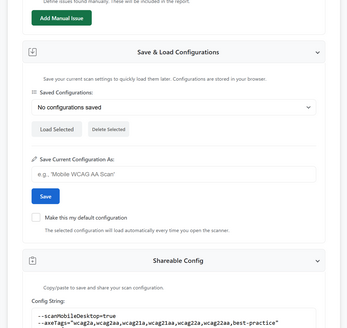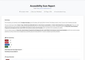 The Accessibility Scanner is a powerful, self-hosted solution designed to streamline and enhance your web accessibility auditing workflow. Leveraging Puppeteer and axe-core, this comprehensive tool moves beyond simple page scans, allowing for full website crawls, sitemap ingestion, and the automation of complex user journeys like logins and form submissions. It automatically identifies violations, bypasses common bot-detection, and generates highly detailed, interactive reports complete with screenshots and integrated manual findings.